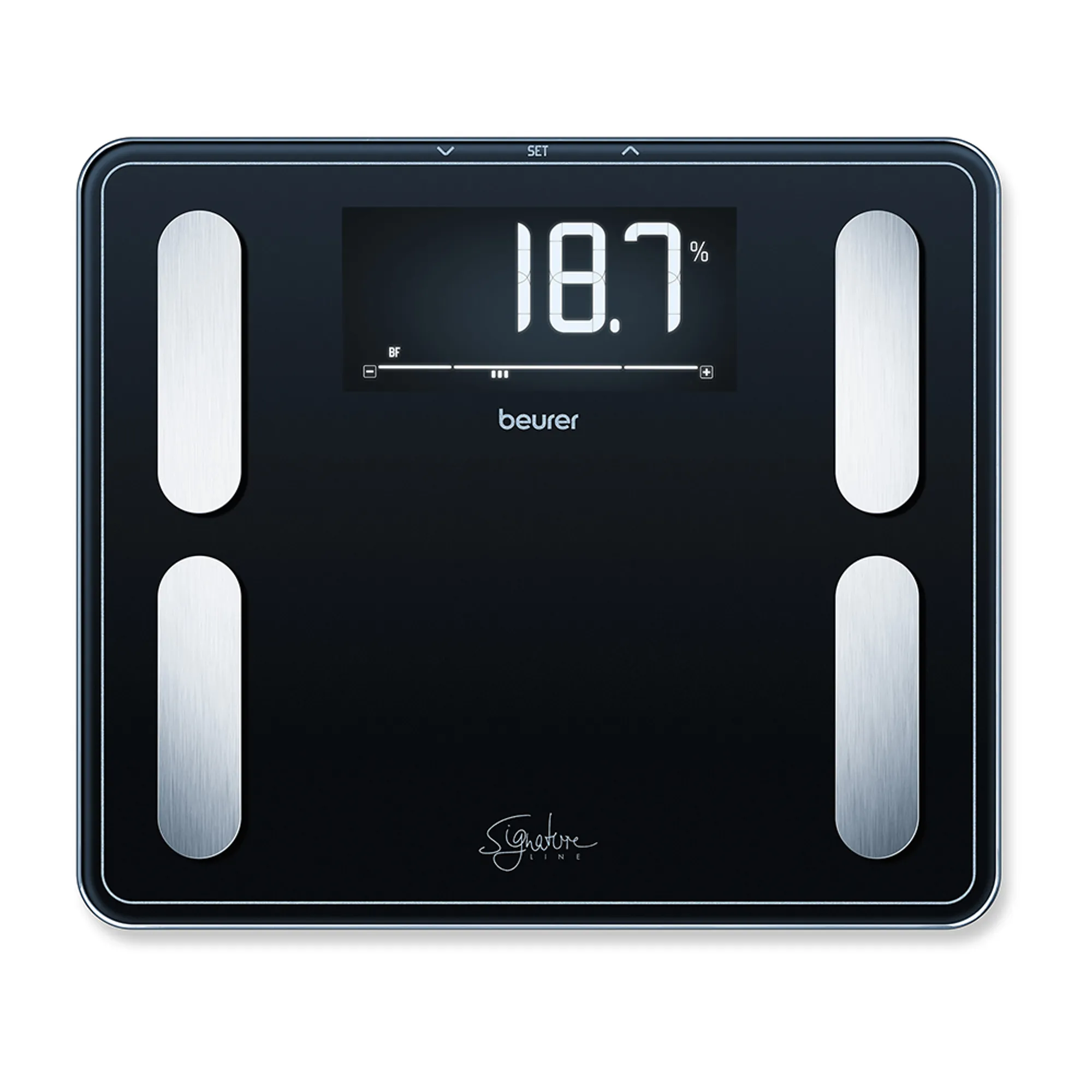 A Beurer BF 410 Signature Line diagnosztikai mérleg a stílus és a technológia tökéletes egyensúlyát képviseli. A készülék méri a testsúlyt, a testzsír-, víz-, izom- és csontarányt, valamint kiszámítja a BMI, BMR és AMR értékeket is. A megvilágított XXL kijelző és a 35 × 30 cm-es, 8 mm vastag biztonsági üveglap stabil és jól látható mérést biztosít.